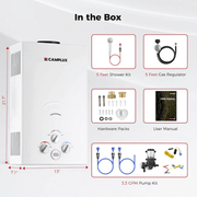 Camplux Propane Portable Tankless Water Heater Outdoor, Camplux 2.64 GPM Instant Hot Camping Showers with 3.3 GPM Water Pump & Pipe Strainer Product Specifications
