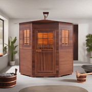 This is one of the corner saunas that are incredibly popular due to how they feel spacious despite being compact. They fit in the corner and look luxurious. Fitting up to 4 people, these corner saunas are constructed using tough Canadian red cedar wood and feel more spacious than they appear from the outside.